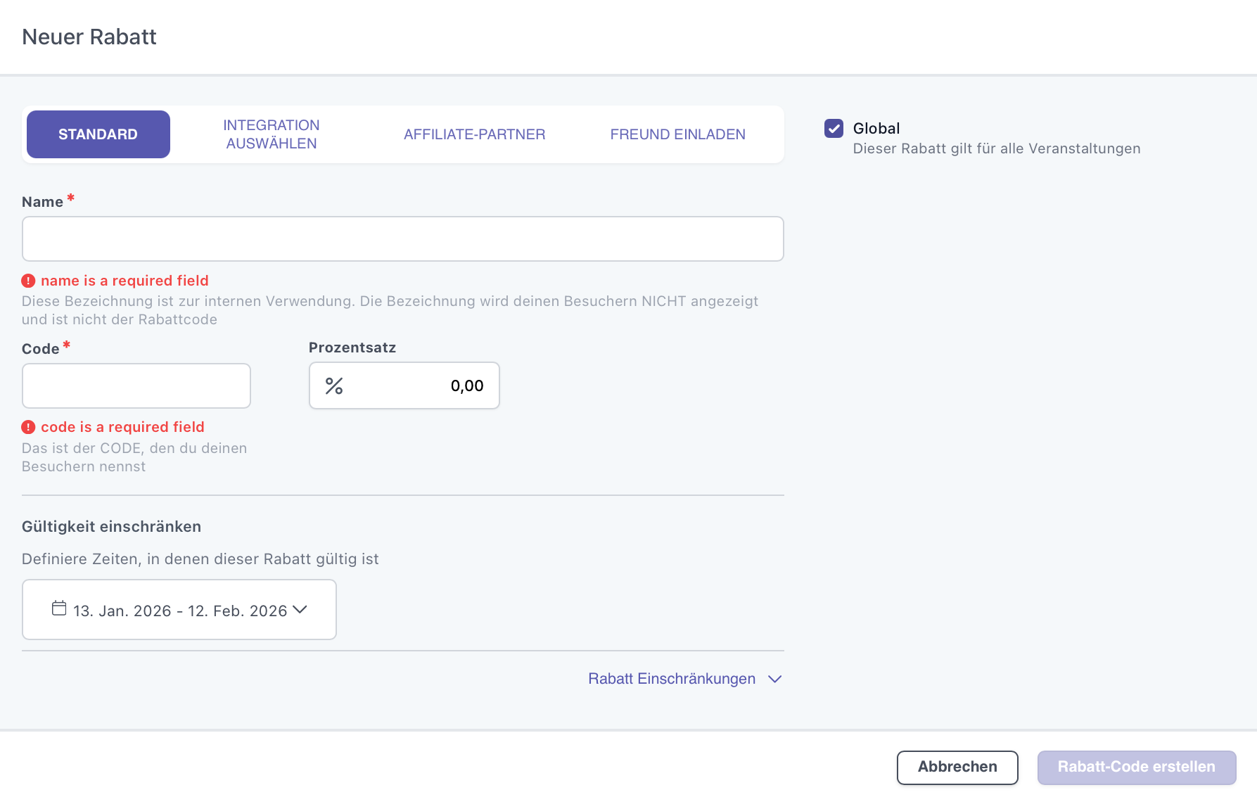 Viele Veranstalter empfinden Promo-Codes als aufwendig oder kompliziert – vor allem, wenn es um Laufzeiten, Mindestmengen oder Nutzungsgrenzen geht.